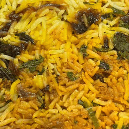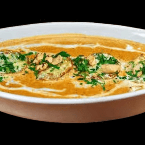 Has cashews. Succulent boneless chicken cooked in a rich cashew, poppy seeds & saffron gravy. Served with rice.