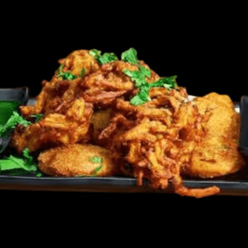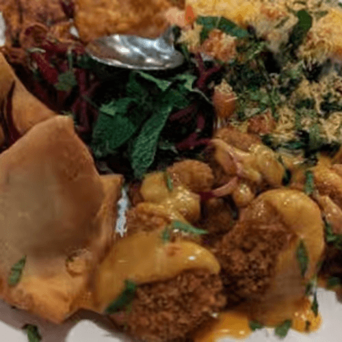 2 samosa, aam patta chat, asst vegetable pakora, cauliflower bang bang (v)