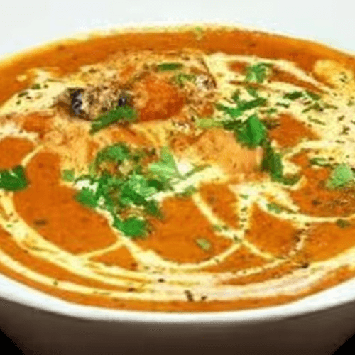 Has cashews. Pulled chicken served in a silky smooth creamy tomato sauce. Served with rice.