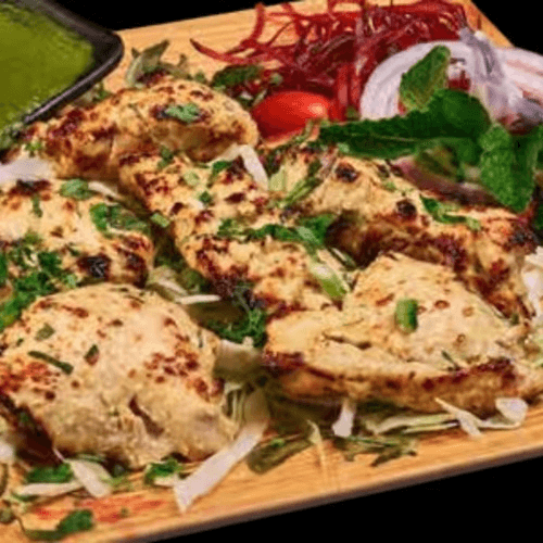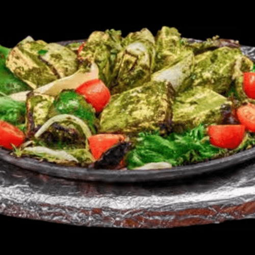 Paneer marinated in mint, basil & cilantro cooked moist in a clay oven. Vegetarian. Gluten Free.