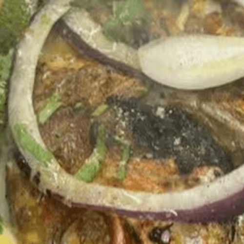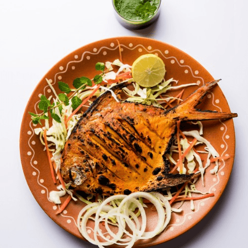 Whole pomfret fish marinated in spices & grilled to perfection. Gluten Free.