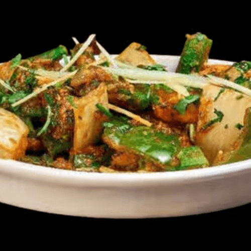 Wok prepared succulent baby goat with julienned ginger peppers & onions with aromatic herbs & spices