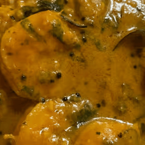 South Indian spicy peppery chicken curry tampered with curry leaves poppy seeds in a coconut curry sauce. Served with rice.