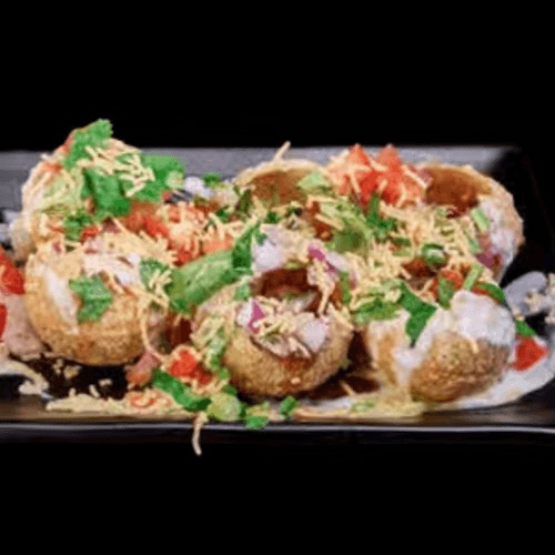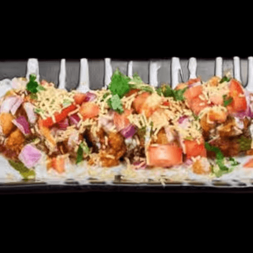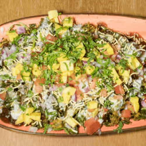 Flat poori topped with potatoes, chopped onions, tomatoes, chat masala, sev, yogurt & chutney