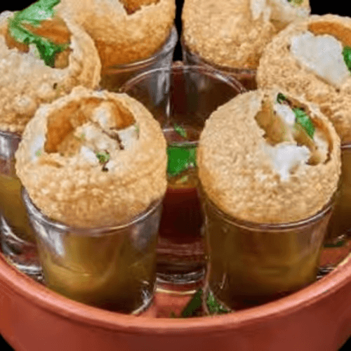 The favorite street food of India. Puffed poori filled with potatoes in spices served with flavored water. Vegan.