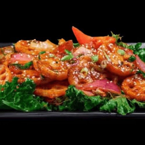 Jumbo shrimps tossed in a spicy chili sauce. Served with rice